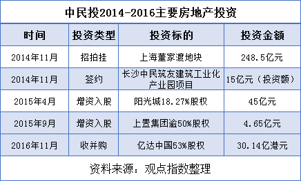 數(shù)據(jù)也顯示,中民投在設(shè)立僅三個(gè)月后即2014年11月,便豪擲248.5億元奪下上海董家渡地王。此后兩年內(nèi)又先后成為上置集團(tuán)、億達(dá)中國的控股股東,還入股陽光城18.27%成為單一最大股東。