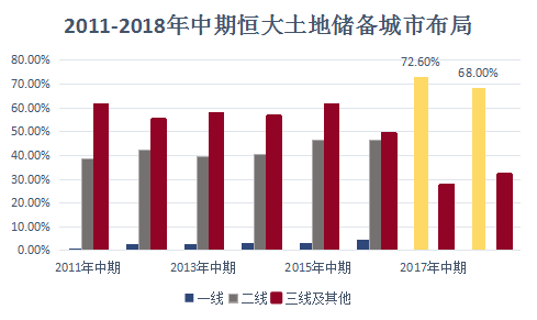 直到2013年,恒大的銷售過了1004億,才提出要向一二線進(jìn)軍。彼時中國的地產(chǎn)商開始往三線走。2013-2017年,恒大開始調(diào)整戰(zhàn)略,經(jīng)過5年的時間,2018年中期恒大3.05億土地儲備中,一二線城市土地儲備原值達(dá)3464億元,占比約68%,三線城市土儲原值1666億元,占比約32%。
