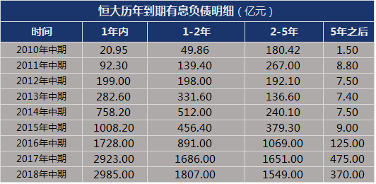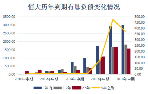 2010年中期,恒大的有息負(fù)債為252.73億元,其中1年內(nèi)及1-2年的負(fù)債占總有息負(fù)債的28.02%,為70.81億元,短期償還壓力并不大。不過隨著雪球越滾越大,到2012年中期,1年內(nèi)及1-2年的負(fù)債占比超過一半,為66.54%,總額達(dá)到596.6億元。