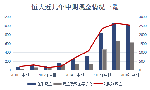 細(xì)分來看,恒大每年的受限制現(xiàn)金也在不斷擴大,2010年為85.37億元,占總現(xiàn)金的46.18%;2016年中期則上升為937.55億元,經(jīng)過一年后,2017年突破千億大關(guān),達(dá)到1055.3億元。所幸的是,在總現(xiàn)金中的占比不斷下降,2018年中期也將下跌為39.31%。