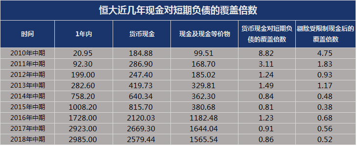 按此計算,若將受限制現(xiàn)金包含在內(nèi),恒大現(xiàn)金對短期負(fù)債的覆蓋倍數(shù)呈現(xiàn)波動下降趨勢,其中2017年中期及2018年中期為0.91和0.86。若將受限制現(xiàn)金提出在外,覆蓋倍數(shù)則由2010年中期的4.75下降至2018年中期的0.52.