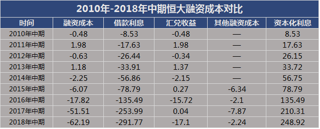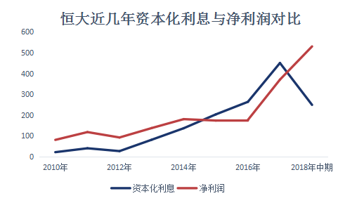 從財報上的數(shù)據(jù)來看,2010-2014年,恒大的凈利潤均能完全覆蓋資本化利潤。進(jìn)入2015年,資本化利息首次超越凈利潤,處于紅線的上方。2018年中期,恒大的凈利潤為530.26億元,超越引入戰(zhàn)投時承諾的2018年凈利潤達(dá)到約500億元。不過,對比兩者來看,資本化利息為248.92億元,成為2015年后首次低于凈利潤的年份。