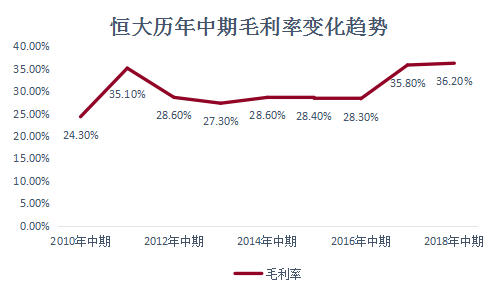 需要注意的是2017年和2018年中期,恒大的毛利率出現(xiàn)比較大的上升趨勢,為35.8%和36.2%。不過要正視的是,目前報表中反映出來的毛利率,是前期拿土地的盈利體現(xiàn),過去2013-2015年,土地成本相對較低,尤其是2015年前所拿的土地價格,對比其售價而言成本優(yōu)勢明顯。因此這樣的高毛利率顯然不可持續(xù),行業(yè)比較普遍的觀點是未來房企的毛利率下滑將成為不可扭轉(zhuǎn)的趨勢。