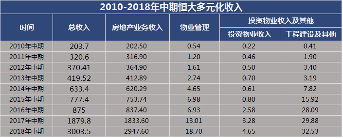 從財報數(shù)據(jù)來看,2010年中期,恒大的房地產(chǎn)開發(fā)業(yè)務(wù)收入幾乎等同于總收入,而物業(yè)管理為0.54億元,投資物業(yè)收入為0.22億元,工程建設(shè)及其他業(yè)務(wù)則為0.41億元。換句話說,多元化業(yè)務(wù)占總收入的比例大致為0.001%。