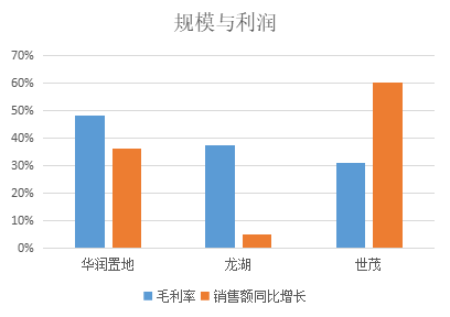 規(guī)模和利潤于房企而言,如同魚和熊掌一樣難以兼得。特別是在房地產(chǎn)市場當下的寒冬,很多房企都迫于生存的壓力而開始放松對規(guī)模的追求。同樣在第十名上下的房企龍湖,上半年的毛利率達到了37.1%,但銷售額增長僅為4.8%。而世茂房地產(chǎn)銷售額在上半年同比大幅增長60%,但毛利率只有31%。