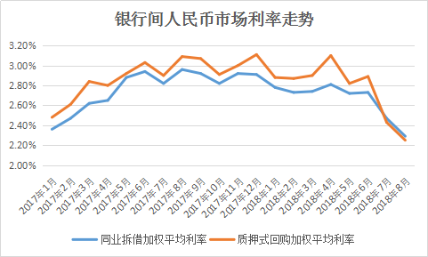 至2018年8月份,銀行間人民幣市場同業(yè)拆借加權(quán)平均利率2.29%,環(huán)比、同比分別低0.18個(gè)、0.67個(gè)百分點(diǎn);質(zhì)押式回購加權(quán)平均利率2.25%,環(huán)比、同比分別低0.18個(gè)、0.84個(gè)百分點(diǎn)。這兩個(gè)指標(biāo)利率均創(chuàng)下2017年以來最低水平。同期市場上以拆借、限券和回購方式日均成交4.73萬億元,同比增長45.6%。