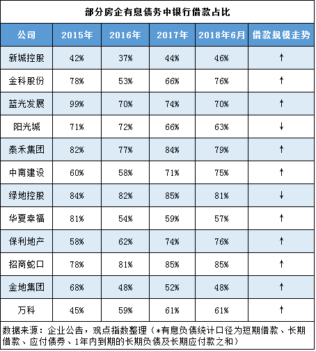 通過銀行間市場獲得短期和中長期融資支持,仍是大部分房企最重要的融資渠道。2018年上半年,列入統(tǒng)計(jì)的12家A股房企,有息負(fù)債中銀行借款占比超過50%的達(dá)到10家,最高約達(dá)85%;僅有金地集團(tuán)、新城控股分別為48%、46%。