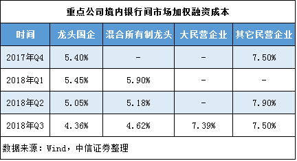 中信證券發(fā)布的統(tǒng)計(jì)數(shù)據(jù)也顯示,境內(nèi)銀行間市場融資的不同類型房企,加權(quán)融資成本按“國企-混合所有制-大型民企-其它民企”呈逐級(jí)上升趨勢。2018年三季度,龍頭國企的平均融資成本甚至與“其它民企”相差3.14個(gè)百分點(diǎn)。