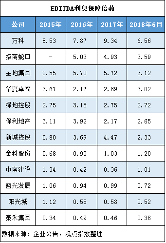 而總利息保障方面,本文引入EBITDA利息保障倍數(shù)指標(biāo)(利潤總額、利息支出總和,除以利息支出),它是衡量企業(yè)支付負(fù)債能力的指標(biāo),倍數(shù)越大,債權(quán)的安全程度越高。由于房地產(chǎn)結(jié)算收入多集中在下半年,從而影響利潤總額,因此主要觀察完整年度的EBITDA利息保障倍數(shù)。