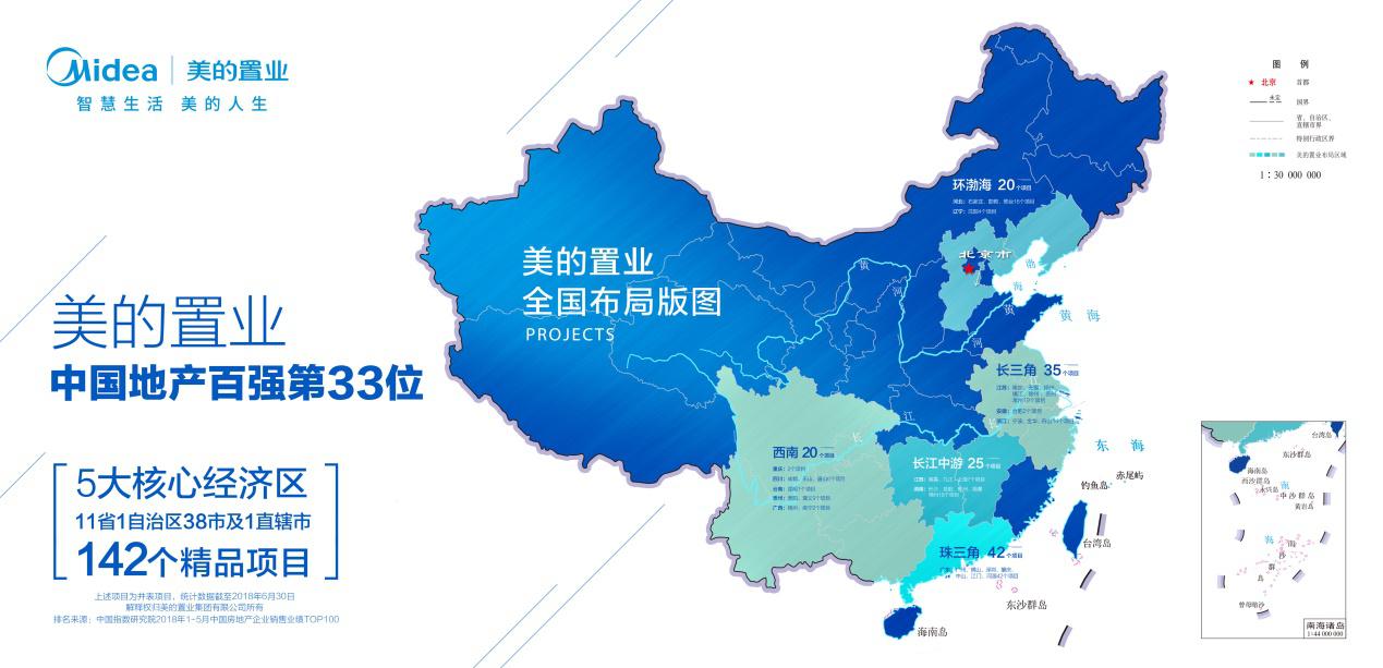 截至2018年6月30日,美的置業(yè)已在珠三角、長三角、長江中游、環(huán)渤海、西南經(jīng)濟區(qū)5大區(qū)域?qū)嵤?zhàn)略布局,共布局了142個精品項目,覆蓋11省、1個自治區(qū)的38市,以及1個直轄市。