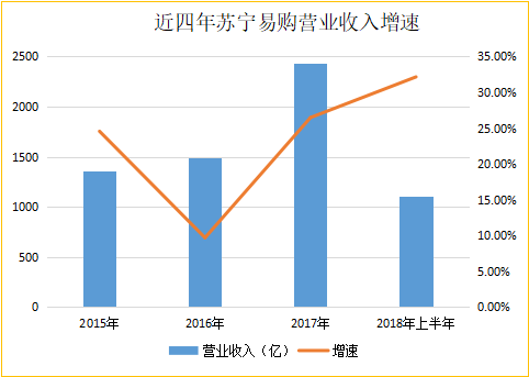 從下圖可以看出,在2016年之后,蘇寧易購(gòu)迎來(lái)了快速增長(zhǎng)期。蘇寧易購(gòu)2015年?duì)I收1356億元,同比增24.56%;2016年?duì)I收1486億元,同比增9.69%;2017年?duì)I收2433億元,同比增26.48%,2018年上半年?duì)I收同比增長(zhǎng)32.16%。