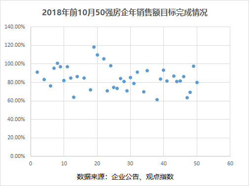 鮮有人留意到,對(duì)中游房企們而言,在下行的環(huán)境中苦苦追趕,完成年初目標(biāo)似乎成了難題。據(jù)觀點(diǎn)指數(shù)不完全統(tǒng)計(jì),截至10月底,在前50強(qiáng)房企中,有披露過全年目標(biāo)卻完成不足8成的共有13家,且多集中在20-50位,有的甚至完成不到70%。