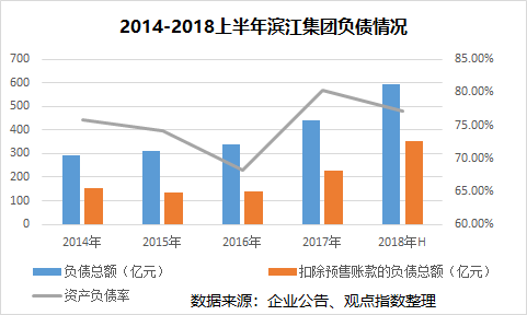 截至2018年9月30日,濱江的負(fù)債總額為670億元,資產(chǎn)負(fù)債率為79.5%,若扣除預(yù)售賬款的負(fù)債部分,其負(fù)債額則為392.25億,資產(chǎn)負(fù)債率約為46.5%。