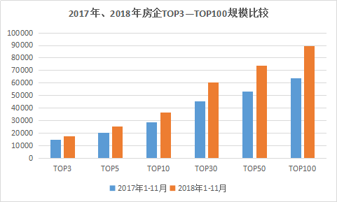 根據(jù)“觀點指數(shù)·2018年1-11月中國房地產(chǎn)企業(yè)銷售金額TOP100”來看,1-11月TOP5、TOP10、TOP30、TOP50、TOP100的銷售額分別為25287億元、36747.66億元、60697.79億元、73879億元、89642.39億元??傮w上說,與2017年同期相比,房企規(guī)模方面保持了一定提升。