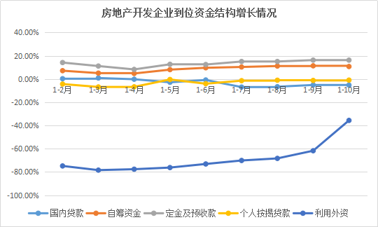 除此之外,國內貸款、利用外資、個人按揭貸款下降5.2%、35.6%、0.9%,均呈現(xiàn)負增長的狀態(tài)。在1-10月份房地產(chǎn)開發(fā)企業(yè)到位資金結構里面,如果將“定金及預收款”和“個人按揭貸款”加總數(shù)后作為“銷售回款”,該部分資金占比達到47.4%。
