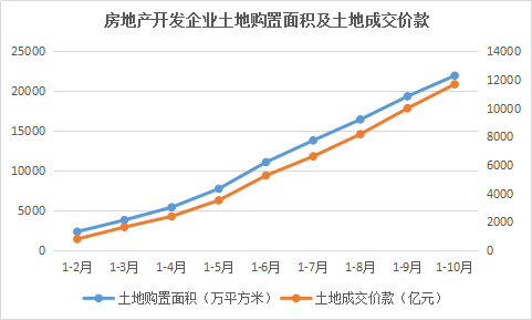 根據(jù)國家統(tǒng)計局最新披露數(shù)據(jù),1-10月份,全國房地產(chǎn)開發(fā)企業(yè)土地購置面積21963萬平方米,同比增長15.3%;土地成交價款11695億元,增長20.6%。當中,進入第三季度以來的增長最為明顯。