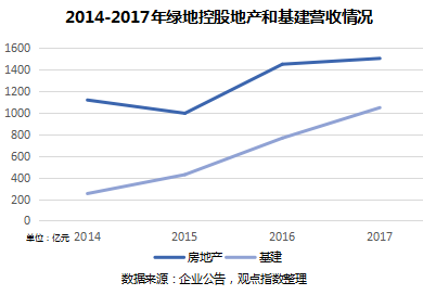 綠地年報顯示,2014年到2017年,綠地基建業(yè)務分別完成250.95億元、426.62億元、1048億元的營業(yè)收入,年復合增長率超過60%。