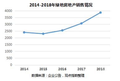 根據(jù)觀點指數(shù)公布的數(shù)據(jù),2018年綠地共完成銷售額3680億元,未實現(xiàn)年初4000億的目標,同比增長幅度達到20%。