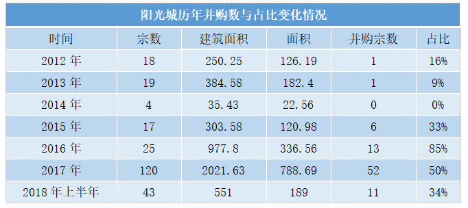 據(jù)觀點指數(shù)統(tǒng)計數(shù)據(jù),兩年間陽光城并購項目達到29宗,收獲土儲936.53萬平方米,占總新增土儲的73.09%。