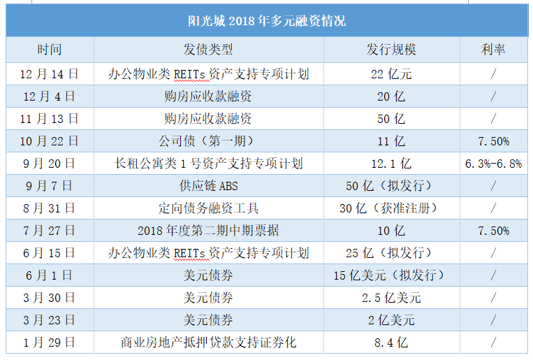 據(jù)觀點指數(shù)不完全統(tǒng)計,2018年陽光城發(fā)行各類多元融資工具,達到370億元的資金額度。