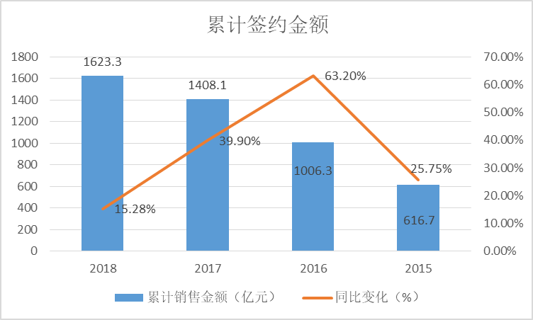 按照金地最新業(yè)績公告顯示,2018全年累計(jì)實(shí)現(xiàn)簽約面積877.8萬平方米,同比上升14.5%;累計(jì)簽約金額1623.3億元,同比上升15.28%。