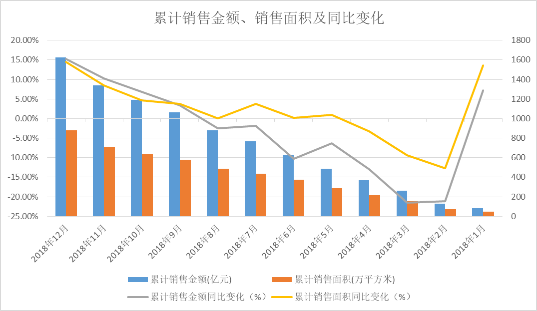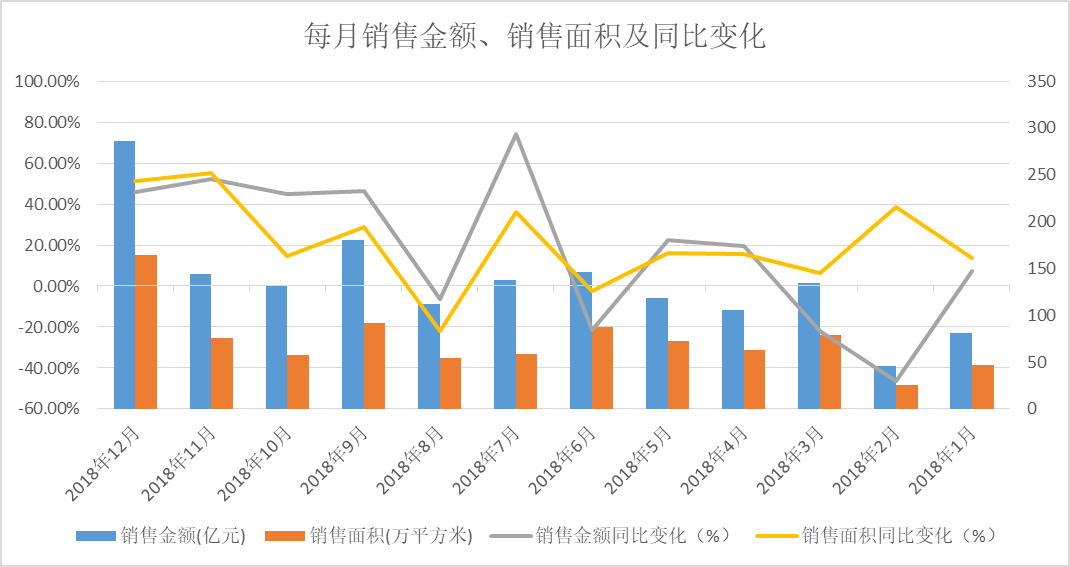 累計(jì)合同銷售金額從2018年2月起至8月同比一直也處于負(fù)增長,全年僅1月、9月、10月、11月以及12月,5個(gè)月同比增長處于正值。