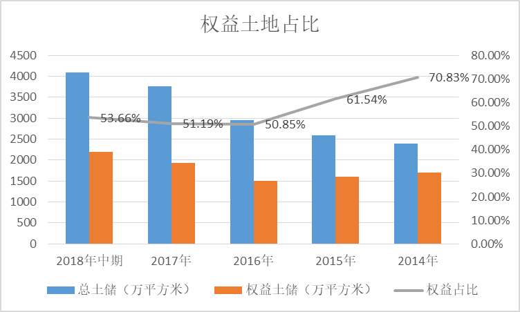 除了城市布局策略上的微調(diào)之外,與萬科相似,“小股操盤”是金地近年土地投資策略之一。按照金地2018年中期報(bào)告披露的數(shù)據(jù),權(quán)益土地占比為53.66%。