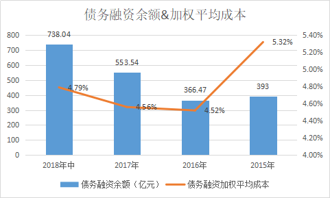 在2015年末至2017年末,金地債務(wù)融資余額分別為393億元、366.47億元、553.54億元;債務(wù)融資余額加權(quán)平均成本分別為5.32%、4.52%、4.56%。