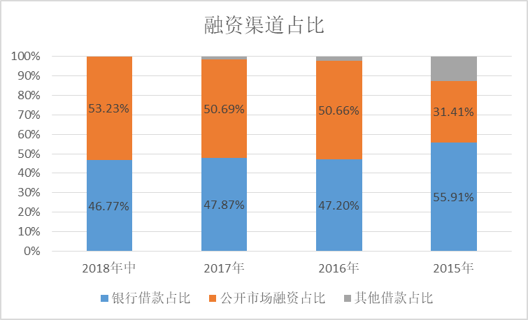 按照金地披露的數(shù)據(jù)顯示,融資渠道主要來源于銀行借款以及公開市場融資,兩者基本各占一半。其中,公開市場融資近年才逐步增加,從2015年的31.41%的占比升至2018年中期的53.23%的占比。