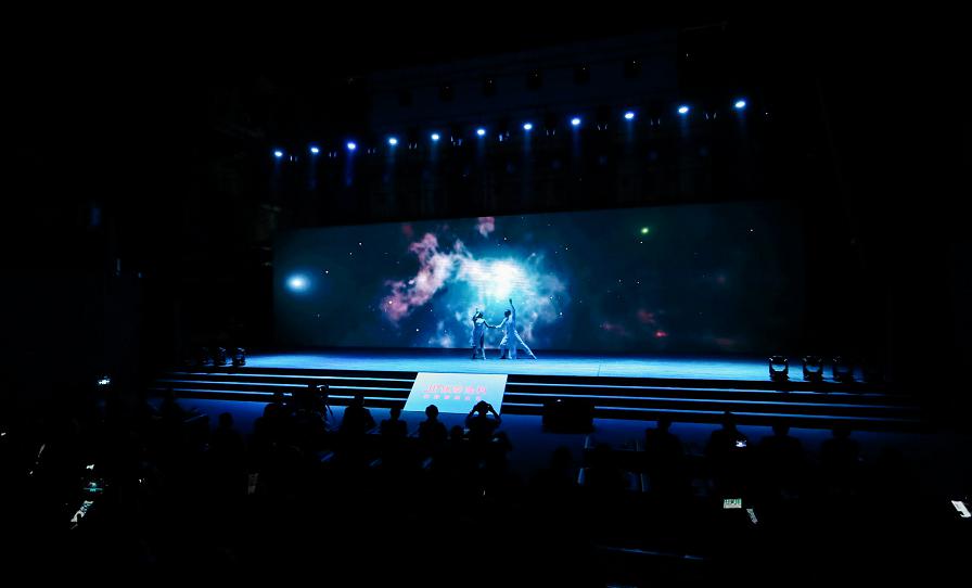 開場(chǎng)舞,投影互動(dòng)舞蹈,剛?cè)岵?jì)的舞者,用優(yōu)雅舞姿配合動(dòng)畫變化動(dòng)作,演繹抽象的造物過(guò)程,也詮釋了金科對(duì)生命建筑的不懈探索與追求。