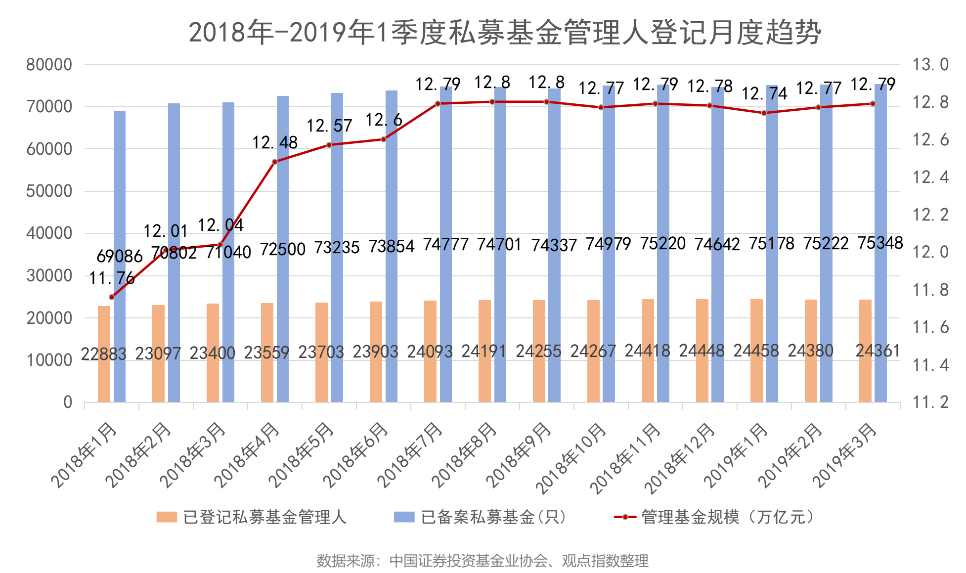 管理基金規(guī)模上,同比上漲幅度在三個(gè)指標(biāo)中最大,達(dá)到6.23%。截至2019年3月末,管理基金規(guī)模12.79萬億元,較上月增加210.36億元,環(huán)比增長0.16%。私募基金管理人員工總?cè)藬?shù)24.10萬人,較上月減少1884人,環(huán)比下降0.78%。