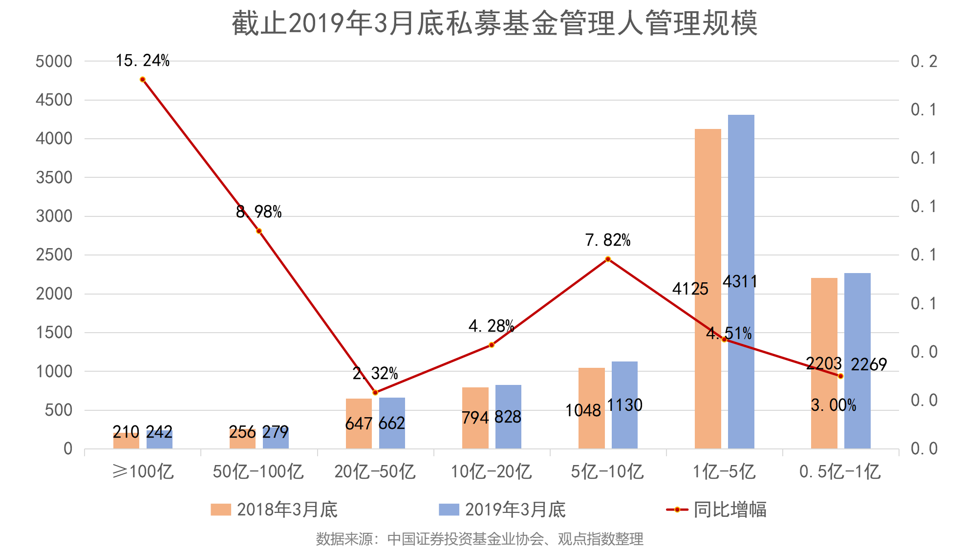 細(xì)分到私募基金管理人的管理規(guī)模來看,截至2019年3月底,已登記的私募基金管理人有管理規(guī)模的共21317家,平均管理基金規(guī)模6.00億元。