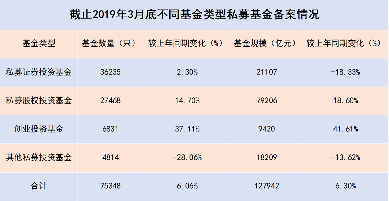已備案的私募基金方面,截止2019年3月底,已備案私募基金75348只,比去年同期的71040只上升6.06%,較上月增加126只,環(huán)比增長0.17%。