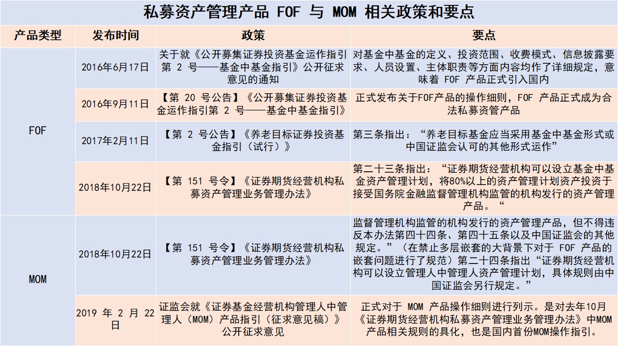 另一個(gè)值得關(guān)注的重點(diǎn)是,與私募FOF相對(duì)應(yīng),2019年2月22日,證監(jiān)會(huì)就《證券基金經(jīng)營機(jī)構(gòu)管理人中管理人(MOM)產(chǎn)品指引(征求意見稿)》公開征求意見,這也是對(duì)去年10月《證券期貨經(jīng)營機(jī)構(gòu)私募資產(chǎn)管理業(yè)務(wù)管理辦法》中MOM產(chǎn)品相關(guān)規(guī)則的具化,是國內(nèi)首份MOM操作指引。