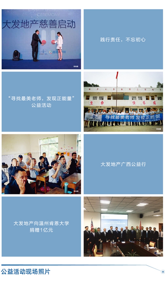 多年來在關(guān)愛兒童、文化教育、社會(huì)公益等領(lǐng)域,大發(fā)地產(chǎn)通過教育捐贈(zèng)、建立助學(xué)基金、結(jié)對(duì)幫扶、慈善捐贈(zèng)等豐富多樣的形式關(guān)愛各類社會(huì)群體,積極踐行企業(yè)公民的社會(huì)責(zé)任,聯(lián)手多家慈善基金會(huì)建立慈善長(zhǎng)效機(jī)制,開辟出一條長(zhǎng)效持續(xù)、體系完備、傳承發(fā)揚(yáng)的責(zé)任之路。