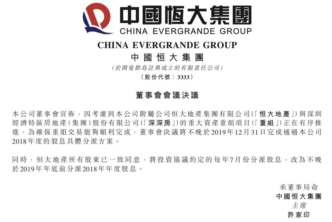 7月18日,中國恒大(3333.HK)發(fā)布公告,因考慮到旗下恒大地產與深深房的重大資產重組正在有序推進,為確保重組順利完成,將于2019年12月31日前完成通過2018年度的股息具體分派方案。