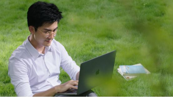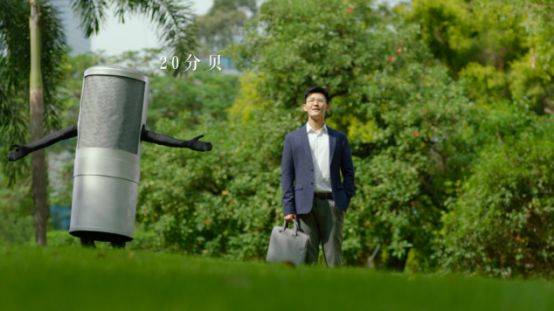 隨著主人公進入了辦公園區(qū)內(nèi),草坪、綠蔭、風聲、鳥語,使得主人公的心情豁然開朗,筆者也終于get到了這個廣告片所宣傳的產(chǎn)品:一個環(huán)境優(yōu)美、綠植滿園的工作目的地。