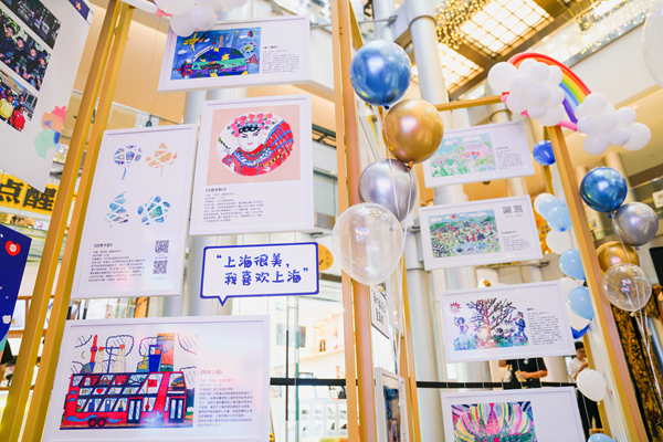 位于金茂大廈-上海J·LIFE 二樓中庭的“益元捐畫”線下自閉癥兒童畫展門庭若市。