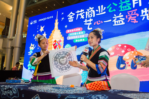 ”深山集市”繡娘們現(xiàn)場表演特制的“金茂商業(yè)公益月”LOGO蠟畫