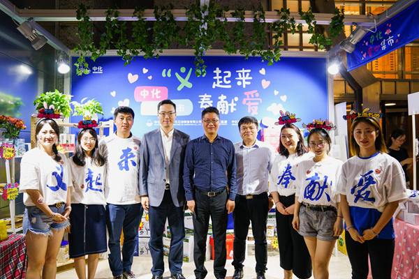 中化集團團委書記、扶貧辦副主任毛適博,中國金茂總裁助理、金茂商業(yè)總經(jīng)理丁蕤與志愿者合影