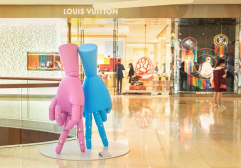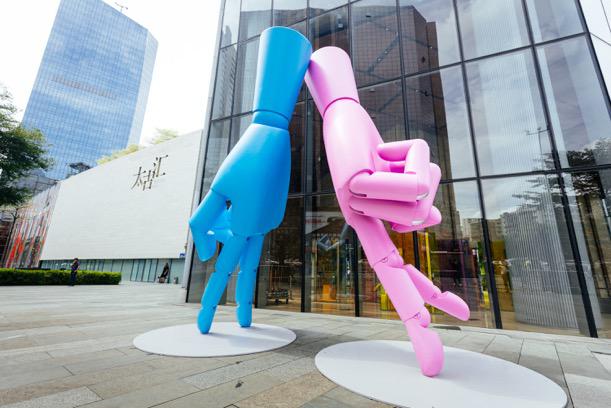 除了中庭互動(dòng)裝置,活動(dòng)還在商場(chǎng)內(nèi)外不同區(qū)域,布置了多個(gè)“心手相匯”主題藝術(shù)裝置“彩蛋”:L1層?xùn)|廣場(chǎng)上“心手相匯-依偎”主題展陳,以5米高的巨型雕塑呈現(xiàn)雙手相依,而成為“八”的形態(tài),引領(lǐng)往來(lái)人群走入商場(chǎng),透過(guò)人的串連,象征人與人、群眾與廣州太古匯之間密不可分的關(guān)系;L3層南玻璃盒玻璃盒內(nèi)的“心手相匯-匯聚”裝置藝術(shù)作品,集合擺放500只“手”比擬人群,象征廣州太古匯“匯聚”的概念,以階梯向上的行走人群作為陳列展示,期許在未來(lái),商場(chǎng)與群眾如紐帶般持續(xù)連結(jié),共創(chuàng)未來(lái);在商場(chǎng)內(nèi)各層還會(huì)驚喜呈現(xiàn)系列裝置,分別象征都市白領(lǐng)、情侶、家庭的形象,以及人們?cè)诓煌纳鐣?huì)角色轉(zhuǎn)換中打開(kāi)全新世界,如同在訴說(shuō)“最幸福的時(shí)光,是我們?cè)谝黄鹦氖窒鄥R”。
