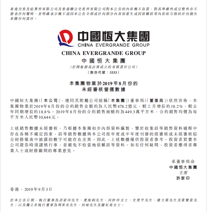 9月3日,中國(guó)恒大(HK.3333)發(fā)布月度業(yè)績(jī),公告顯示,恒大8月銷售478.2億元,環(huán)比增長(zhǎng)18.2%,同比增長(zhǎng)18.8%。