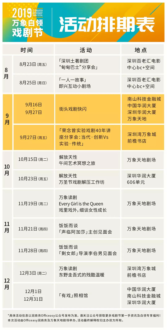 上月,萬象天地劇場及Officeasy聯(lián)合深圳百老匯電影中心為各位白領(lǐng)戲迷們帶來了兩場drama十足的先導(dǎo)活動解饞。9月,隨著戲劇節(jié)正式拉開帷幕,更多精彩活動等你參與!