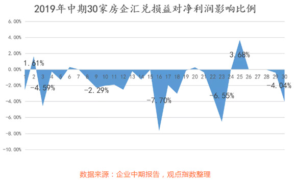 以個(gè)體來(lái)說(shuō),去年上半年,有個(gè)別房企匯兌損失為1.09億元,其凈利潤(rùn)僅為5.74億元,換句話說(shuō),匯兌損失對(duì)其凈利潤(rùn)的影響比率達(dá)到18.99%,而今年上半年其該指標(biāo)有明顯好轉(zhuǎn),為4.04%。在30家房企中,匯兌損失對(duì)其凈利潤(rùn)影響比例最大的達(dá)到7.7%。