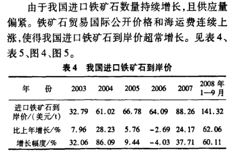 下圖來自《金屬礦山》2009年第1期,中國鋼鐵工業(yè)協(xié)會(huì)發(fā)表的文章里面的數(shù)據(jù),可以看出我國鐵礦石到岸價(jià)格從2003年之后出現(xiàn)了超常規(guī)的大幅度增長。2003年還是32.79美元,2008年1-9月就超過了140美元。