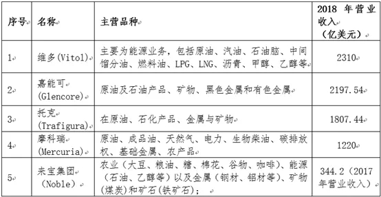 國際上,從事大宗商品供應(yīng)鏈服務(wù)的最為著名公司就是瑞士嘉能可、瑞士摩科瑞、新加坡托克集團(tuán)、瑞士維多,英國來寶五家知名企業(yè),他們從事的主要大宗商品是:石油及其衍生品,金屬,礦產(chǎn)三大項(xiàng),來寶集團(tuán)還涉及到農(nóng)產(chǎn)品。