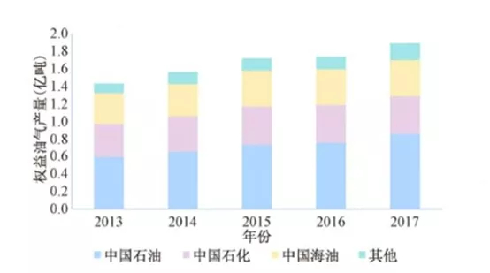 能源部分:國家隊(duì)中國石油,中國石化,中國海洋石油,中國化工都在負(fù)責(zé)中國的石油+天然氣的戰(zhàn)略安全任務(wù),中國本土的石油天然氣產(chǎn)量在2015年達(dá)到峰值后,這幾年處于下降的狀態(tài),但是與此同時(shí)中國幾大國家隊(duì)在海外的權(quán)益油氣當(dāng)量卻在不斷的上升,這是技術(shù)+工程能力換取資源的結(jié)果,下圖來自《2017年國內(nèi)外油氣行業(yè)發(fā)展報(bào)告》,2017年中石油+中石化+中海油三巨頭海外權(quán)益油氣當(dāng)量超過1.8億噸,其中中石油一家公司到2018年海外權(quán)益油氣當(dāng)量就達(dá)到了9800萬噸