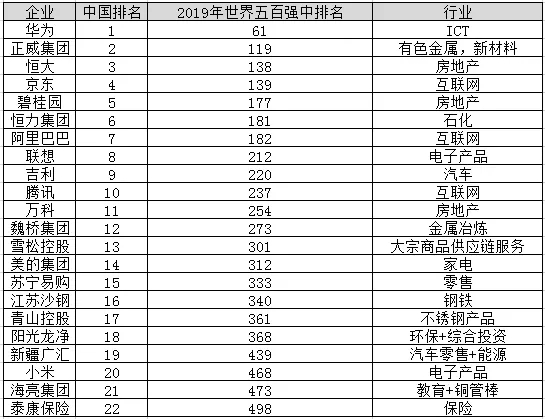 2019年世界五百強(qiáng)里面的中國民營企業(yè)總共有22家,最大的當(dāng)然是華為。