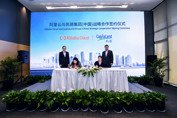 (后排見(jiàn)證)阿里巴巴集團(tuán)首席技術(shù)官兼阿里云智能事業(yè)群總裁張建鋒(左)、負(fù)責(zé)中國(guó)業(yè)務(wù)的凱德集團(tuán)總裁羅臻毓(右)