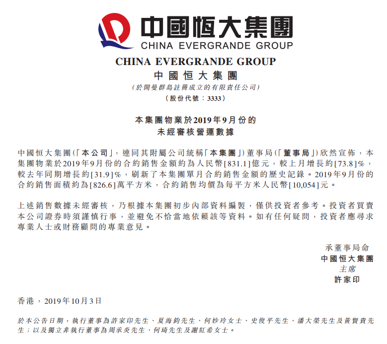 10月3日,中國恒大(HK.3333)發(fā)布月度業(yè)績(jī)公告,恒大9月銷售831.1億元,創(chuàng)公司單月銷售歷史新高,環(huán)比增長(zhǎng)73.8%,同比增長(zhǎng)31.9%。
